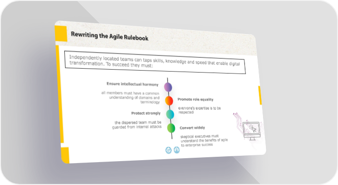 Rewriting the Agile Rulebook Independently located teams can taps skills, knowledge and speed that enable digital transformation. To succeed they must: Ensure intellectual harmony all members must have a common understanding of domains and Promote role equality terminology everyone’s expertise is to be Protect strongly respected the dispersed team must be guarded from internal attacks Convert widely skeptical executives must understand the benefits of agile to enterprise success