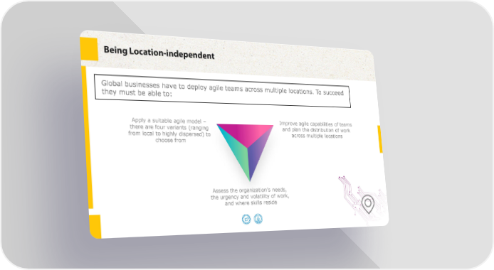 Being Location-independent Global businesses have to deploy agile teams across multiple locations. To succeed they must be able to: Apply a suitable agile model – Improve agile capabilities of teams there are four variants (ranging and plan the distribution of work from local to highly dispersed) to across multiple locations choose from Assess the organization’s needs, the urgency and volatility of work, and where skills reside