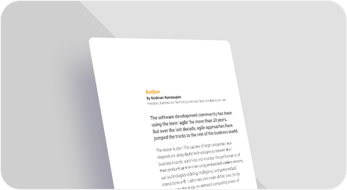 Author By Krishnan Ramanujam President, Business and Technology Services, Tata Consultancy Services The software development community has been using the term ‘agile’ for more than 20 years. But over the last decade, agile approaches have jumped the tracks to the rest of the business world. The reason is clear: The success of large companies now depends on using digital technologies to reinvent their business models; automate and monitor the performance of their products and services using embedded wireless sensors; use technologies to bring intelligence and personalized interactions with customers; and make all this possible by tapping into the huge on-demand computing power of cloud providers. Each article in this issue of Perspectives dissects today’s urgent need for companies to have industrial-strength capabilities in agile to manage their businesses. We group the articles in three sections. 5