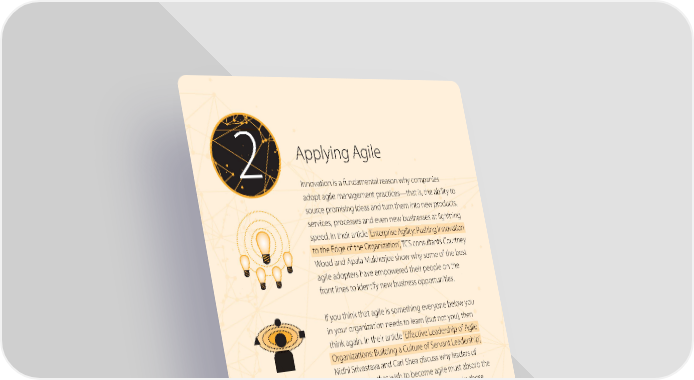 2 Applying Agile Innovation is a fundamental reason why companies adopt agile management practices—that is, the ability to source promising ideas and turn them into new products, services, processes and even new businesses at lightning speed. In their article ‘Enterprise Agility: Pushing Innovation to the Edge of the Organization’, TCS consultants Courtney Wood and Apala Mukherjee show why some of the best agile adopters have empowered their people on the front lines to identify new business opportunities. If you think that agile is something everyone below you in your organization needs to learn (but not you), then think again. In their article ‘Effective Leadership of Agile Organizations: Building a Culture of Servant Leadership’, Nidhi Srivastava and Carl Shea discuss why leaders of organizations that wish to become agile must absorb the mindsets and master the skills required to make those below them successful. In the last article in this section, we are honored to have a pioneer of Silicon Valley-style lean and agile approaches. He is Steve Blank, a Silicon Valley entrepreneur who has been a cog in the wheel of the lean startup movement. Blank more recently has been teaching lean startup approaches to big, longstanding organizations, both in business and government. He tells us about that in our interview with him ‘The Tall Task of Getting Big Companies and Government to Innovate Like Lean Startups’. 8