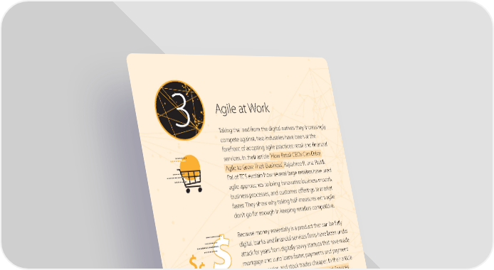 3 Agile at Work Taking the lead from the digital natives they increasingly compete against, two industries have been at the forefront of adopting agile practices: retail and financial services. In their article ‘How Retail CEOs Can Drive Agile to Grow Their Business’, Rajashree R. and Pratik Pal of TCS explain how several large retailers have used agile approaches to bring innovative business models, business processes, and customer offerings to market faster. They show why taking half-measures with agile don’t go far enough in keeping retailers competitive. Because money essentially is a product that can be fully digital, banks and financial services firms have been under $ attack for years from digitally savvy startups that have made $ $ mortgage and auto loans faster, payments and payment processing easier, and stock trades cheaper. In their article ‘Fending Off the FinTechs: How Agile Financial Services Firms are Transforming Their Businesses’, TCS consultants RamanaMurthy Magapu and Sathish Sankaranarayanan explain how a number of established financial institutions have used agile approaches to strike back successfully. They also explain how to get past the barriers that hold financial services firms from embracing agile practices. Finally, in our last article ‘Why Your Agile Team is Better Off Dispersed: The Case for Location-Independent Agile’, I explain why large companies around the world now need to significantly scale up their agile approaches to process improvement, product and service development, and business model innovation. I show why scaling up agile requires making it truly location-independent. 9