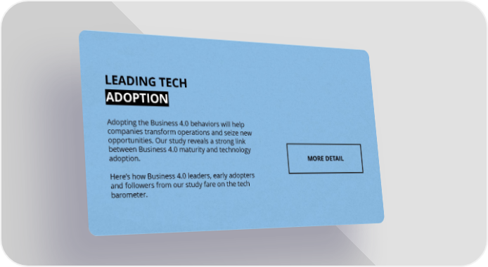 LEADING TECH ADOPTION Adopting the Business 4.0 behaviors will help companies transform operations and seize new opportunities. Our study reveals a strong link between Business 4.0 maturity and technology adoption. MORE DETAIL Here’s how Business 4.0 leaders, early adopters and followers from our study fare on the tech barometer.