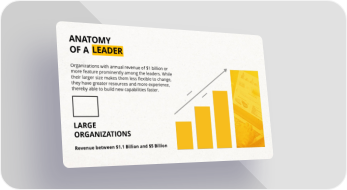 ANATOMY OF A LEADER Organizations with annual revenue of $1 billion or more feature prominently among the leaders. While their larger size makes them less flexible to change, they have greater resources and more experience, thereby able to build new capabilities faster. 40% LARGE ORGANIZATIONS Revenue between $1.1 Billion and $5 Billion