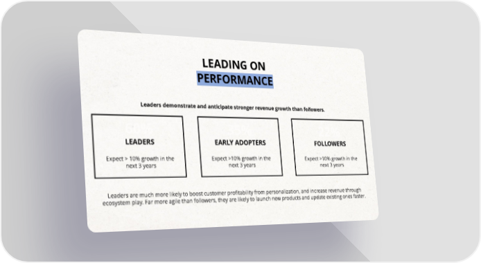 LEADING ON PERFORMANCE Leaders demonstrate and anticipate stronger revenue growth than followers. 60% 35% 22% LEADERS EARLY ADOPTERS FOLLOWERS Expect > 10% growth in the Expect >10% growth in the Expect >10% growth in the next 3 years next 3 years next 3 years Leaders are much more likely to boost customer profitability from personalization, and increase revenue through ecosystem play. Far more agile than followers, they are likely to launch new products and update existing ones faster.