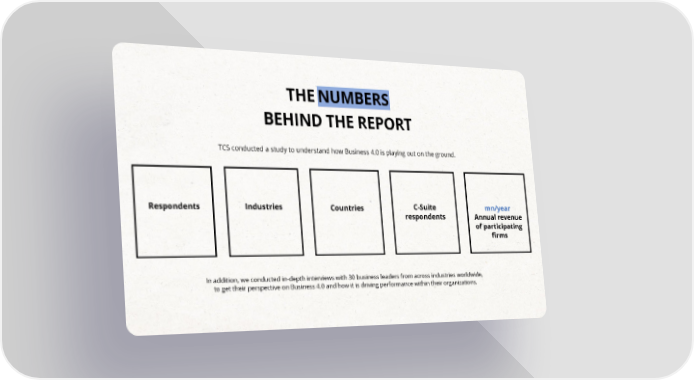 THENUMBERS BEHIND THE REPORT TCS conducted a study to understand how Business 4.0 is playing out on the ground. Respondents Industries Countries C-Suite mn/year respondents Annual revenue of participating firms In addition, we conducted in-depth interviews with 30 business leaders from across industries worldwide, to get their perspective on Business 4.0 and how it is driving performance within their organizations.