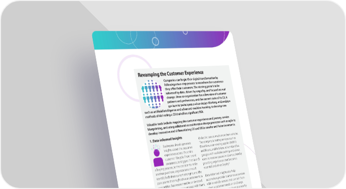 Revamping the Customer Experience Companies can begin their digital transformation by following a two-step process to transform the experience they offer their customers. The starting point is to be informed by data, driven by empathy, and focused on real change. Once an organization has a firm view of customer patterns and preferences, and the current state of its CX, it can turn to techniques such as design thinking, and enablers such as artificial intelligence and advanced machine learning, to develop new methods of delivering a CX that offers significant ROI. Valuable tools include mapping the customer experience and journey, service blueprinting, and using collaborative and iterative design processes such as agile to develop innovative and differentiating CX and UX in smaller and faster increments. 1. Data-informed Insights i3 electric cars as much more than vehicles. 11 0 0 0 0 1 1 Businesses should generate The company is testing services such as 1 01 101 insights about the customer DriveNow, a car-sharing app for BMW i3 experience across the entire and i8 cars, and ParkNow, which identifies customer lifecycle. From brand garages with available parking and allows awareness, to triggers that launch users to reserve spaces in advance, thereby a buying process, to the decision to make providing experiences that becomes another purchase, organizations should 6 essential and drives loyalty. identify both their current strengths and the pain points that might drive a customer to a Data-informed insights also help competitor. Businesses need to understand automakers provide maintenance services where customers want to engage with them, with in-vehicle sensors that can tell them what needs customers want fulfilled and when a customer needs an oil change. how they want to engage with the brand. On-board GPS can steer them to a nearby partner or dealer. This provides automakers For example, by using data to understand with incentives to use their partners and what people do in their cars, automakers are create incremental revenue while providing extending their relationship with customers a valuable, compelling CX that tells the beyond the point of purchase. By leveraging customer the company knows who they are the Internet of Things (IoT), artificial and what they want and need. intelligence (AI) and analytics, automakers are rapidly becoming information companies. Automaker BMW, for example, thinks of its 6 Harvard Business Review, Designing a Marketing Organization for the Digital Age, October 1, 2015, accessed May 23, 2018, https://hbr.org/ sponsored/2015/10/designing-a-marketing-organization-for-the-digital-age 4