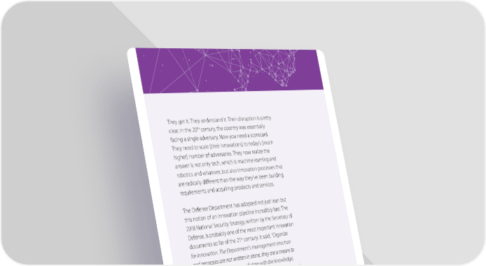 They get it. They understand it. Their disruption is pretty th clear. In the 20 century, the country was essentially facing a single adversary. Now you need a scorecard. They need to scale [their innovations] to today’s [much higher] number of adversaries. They now realize the answer is not only tech, which is machine learning and robotics and whatever, but also innovation processes that are radically different than the way they’ve been building requirements and acquiring products and services. The Defense Department has adopted not just lean but this notion of an innovation pipeline incredibly fast. The 2018 National Security Strategy, written by the Secretary of Defense, is probably one of the most important innovation st documents so far of the 21 century. It said, “Organize for innovation.The Department’smanagement structure and processes are not written in stone, they are a means to an end–empowering the warfighter with the knowledge, equipmentand support systems to fight and win. Department leaders will adapt their organizational structures to best support the Joint Force. If current structures hinder substantial increases inlethality or performance, it is expected that Service Secretaries and Agency heads will consolidate, eliminate, or restructure as needed. The Department’s leadership is committed to changesin authorities, granting of waivers, andsecuring external support for streamlining processes and organizations.” It feels a lot like the lean startup take-up that we had in Silicon Valley. It’s catching on in the U.S. government, and it’s saving lives.