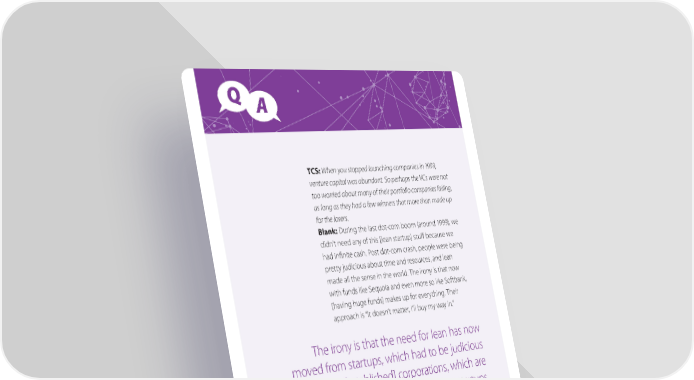 Q A TCS: When you stopped launching companies in 1999, venture capital was abundant. So perhaps the VCs were not too worried about many of their portfolio companies failing, as long as they had a few winners that more than made up for the losers. Blank: During the last dot-com boom (around 1999), we didn’t need any of this [lean startup] stuff because we had infinite cash. Post dot-com crash, people were being pretty judicious about time and resources, and lean made all the sense in the world. The irony is that now with funds like Sequoia and even more so like Softbank, [having huge funds] makes up for everything. Their approach is “It doesn’t matter, I’ll buy my way in.” The irony is that the need for lean has now moved from startups, which had to be judicious with cash, to [established] corporations, which are actually much more threatened than startups. The real surprise for me is that some startups now have more capital than large corporations. Herein lies the opportunity of using lean startup approaches in corporations. Big companies that survive are no longer just delivering what McKinsey called Horizon One innovation (incremental features, colors,