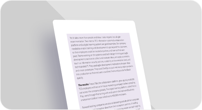 Yet it takes more than people and ideas. It also requires lots of agile experimentation. Two internal TCS information systems (a collaboration platform and a digital learning system) are good examples. Our company needed to enable training and development to go beyond the classroom, so that employees could be located anywhere, and learn at their own pace. Teams working on the systems used both design thinking and agile development practices to collect and evaluate ideas, and apply constraints (such as information security policies, scalability at the enterprise level, and 10 technical debt ) They used agile development methods to sharpen ideas and create prototypes. They used DevOps to push minimally viable products into production so that end users could test them and provide feedback quickly. The results: Fresco Talk, the collaboration platform, grew quickly to 60,000 TCS employees without an in-house marketing campaign before spreading out across the company globally. The digital learning platform, called Fresco Play, went through fine-tuning with end users in the real world business environment before it was rolled out to 400,000 employees. Forward-looking companies are also collaborating outside of their corporate walls to harvest innovative ideas from their ecosystem partners. A leading U.S. audio equipment manufacturer and a major toy maker are each tapping partners (such as TCS) to generate new product ideas through a structured ideation process. The two companies then flesh out the most promising ideas and test them with business stakeholders before they enter product development cycles. 10 Technical debt refers to the work a team will later need to perform to address problems that were not apparent at the time the software product was first developed. See Agile Alliance, Introduction to the Technical Debt Concept, accessed March 13, 2018, https://www.agilealliance.org/introduction-to-the-technical-debt-concept/