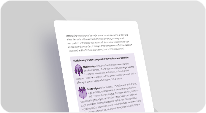 Leaders who commit to the lean-agile approach must also commit to rethinking where they surface ideas for improvements everywhere, including those for new products and services. Such leaders will also create an entrepreneurial work environment that extends to the edges of the company—outside (those that touch customers) and inside (those that support those who touch customers). The following is what a snapshot of that environment looks like: Outside edge. Here, an agile enterprise empowers frontline people who interact directly with customers, including employees in customer services, sales and delivery, to discover unfilled customer needs. For example, it could be an idea for a new product or service offering, or a better way to deliver that product or service. Inside edge. This is about support functions such as HR, finance, legal, and procurement working to improve the ways they help their customer-facing colleagues. This means rethinking traditional ways of working that rely on narrowly defined specialized roles, predictable scope, pre-defined timelines, budgets and stang. New thinking—about improving existing systems and service—will enable faster responses not only to the internal customers, but will improve the organization’s ability to serve external customers. For example, think of a traditional contracting process with fixed terms. If a new type of customer service option requires a more flexible scope with few pre-defined requirements, adaptive procurement, and legal functions will be poised to make that a reality faster than before. By adopting lean-agile ways of working where innovation is an everyday phenomenon, the people at the outside and inside edges of an agile enterprise will be able to create and implement new ideas more rapidly.