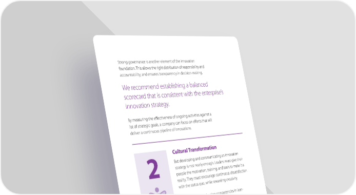 Strong governance is another element of the innovation foundation. This allows the right distribution of responsibility and accountability, and ensures transparency in decision-making. We recommend establishing a balanced scorecard that is consistent with the enterprise’s innovation strategy. By measuring the effectiveness of ongoing activities against a list of strategic goals, a company can focus on efforts that will deliver a continuous pipeline of innovations. Cultural Transformation But developing and communicating an innovation 2 strategy is not nearly enough. Leaders must give their people the motivation, training, and tools to make it a reality. They must encourage continuous dissatisfaction with the status quo, while rewarding creativity. Leaders must also develop competencies in lean- agile techniques: € Empowered teams who can develop minimally viable products and services to test with customers, to ‘fail fast’ and learn from iterative attempts. € Systems thinking: focusing on how a system’s parts interrelate, and how that system works within larger systems. € Design thinking: ide a-generation and problem- solving that looks at human behavior and needs, in 9 addition to business and technology factors. 9 Harvard Business Review, Design Thinking, June 2008, accessed March 13, 2018, https://hbr.org/2008/06/ design-thinking