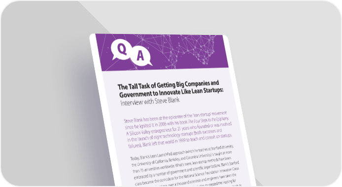 Q A The Tall Task of Getting Big Companies and Government to Innovate Like Lean Startups: Interview with Steve Blank Steve Blank has been at the epicenter of the ‘lean startup’ movement since he ignited it in 2006 with his book The Four Steps to the Epiphany. A Silicon Valley entrepreneur for 21 years who founded or was involved in the launch of eight technology startups (both successes and failures), Blank left that world in 1999 to teach and consult on startups. Today, Blank’s Lean LaunchPad approach (which he teaches at Stanford University, the University of California, Berkeley, and Columbia University) is taught at more than 75 universities worldwide. What’s more, lean startup methods have been embraced by a number of government and scientific organizations. Blank’s Stanford class became the curriculum for the National Science Foundation Innovation Corps in 2011; since that time, over a thousand scientists and engineers have taken the course to help commercialize their ideas. Blank also co-created the Hacking for Defense and Hacking for Diplomacy programs, which use lean startup methods to address critical national security problems. You can read his extensive writings at www.steveblank.com. At the turn of the century, one of Blank’s students was Eric Ries, who launched two companies that Blank had funded. The first practitioner of Blank’s lean startup method, Ries took the concept mainstream after publishing two books, The Lean Startup and The Startup Way.