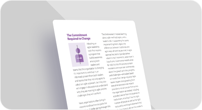 The Commitment The third element involves learning Required to Change about agile methodologies, and a Adopting an leader’s role in supporting the teams agile leadership implementing them. Again, the style first requires differences between traditional and a program that agile ways of working are vivid. In agile builds awareness approaches, teams typically deliver among both value in small increments, rather than in leaders and big chunks. Governance models allow teams that the organization is changing. for visibility into the process as team It’s important to seek buy-in, or members communicate continuously informed consent from both leaders about the group’s activities, progress, and teams that they not only agree to and challenges—and adapt based adopt an agile approach, but they also on needs that change regularly. Agile will engage in discussions to understand teams require strong backing from why they are moving to agile and the executive sponsors who make it challenges they will confront. possible to recruit people from across the organization as needed, including Next, organizations often bring in a product owner from the business to experienced teachers to guide the lead a team, ensuring it has the right transition. A leader going through this number of people as well as the right process can benefit from an outside tools, and a working environment that perspective to help her envision what will allow them to deliver the products she will need to do. The transition to the enterprise needs. an agile culture takes time—typically more than a year to complete—and it affects all aspects of the organization.