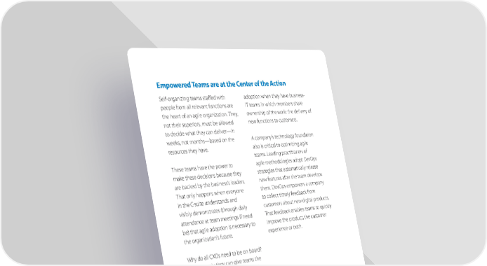 Empowered Teams are at the Center of the Action Self-organizing teams staffed with adoption when they have business- people from all relevant functions are IT teams in which members share the heart of an agile organization. They, ownership of the work: the delivery of not their superiors, must be allowed new functions to customers. to decide what they can deliver—in weeks, not months—based on the A company’s technology foundation resources they have. also is critical to optimizing agile teams. Leading practitioners of These teams have the power to agile methodologies adopt DevOps make these decisions because they strategies that automatically release are backed by the business’s leaders. new features after the team develops That only happens when everyone them. DevOps empowers a company in the C-suite understands and to collect timely feedback from visibly demonstrates (through daily customers about new digital products. attendance at team meetings if need That feedback enables teams to quickly be) that agile adoption is necessary to improve the product, the customer the organization’s future. experience or both. Why do all CXOs need to be on board? Because only they can give teams the flexibility to define the scope of their work and prioritize goals based on the business value their products deliver to customers. Banks succeed with agile