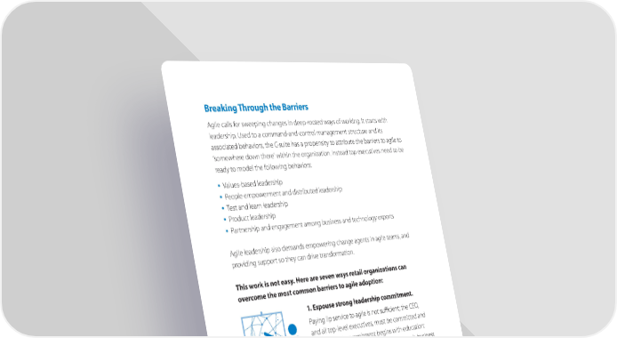 Breaking Through the Barriers Agile calls for sweeping changes in deep-rooted ways of working. It starts with leadership. Used to a command-and-control management structure and its associated behaviors, the C-suite has a propensity to attribute the barriers to agile to ‘somewhere down there’ within the organization. Instead top executives need to be ready to model the following behaviors: € Values-based leadership € People empowerment and distributed leadership € Test and learn leadership € Product leadership € Partnership and engagement among bus iness and technology experts Agile leadership also demands empowering change agents in agile teams, and providing support so they can drive transformation. This work is not easy. Here are seven ways retail organizations can overcome the most common barriers to agile adoption: 1. Espouse strong leadership commitment. Paying lip service to agile is not sucient; the CEO, and all top-level executives, must be committed and engaged. This commitment begins with education: engaging coaches and trainers who can teach business stakeholders the principles of agile, and conduct exercises to practice and inculcate its collaborative and inclusive methodology. All business leaders should understand and internalize both the need for change and the essence of the agile approach. They must assume product ownership, including responsibility for defining the product roadmap and instituting short feedback loops to learn from and act on end-user feedback.
