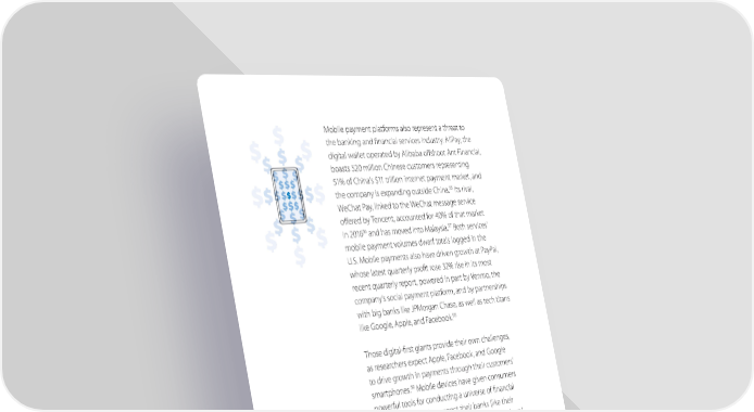 Mobile payment platforms also represent a threat to the banking and financial services industry. AliPay, the digital wallet operated by Alibaba offshoot Ant Financial, boasts 520 million Chinese customers representing 51% of China’s $11 trillion internet payment market, and the company is expanding outside China.55 Its rival, WeChat Pay, linked to the WeChat message service offered by Tencent, accounted for 40% of that market 56 57 in 2016 and has moved into Malaysia. Both services’ mobile payment volumes dwarf totals logged in the U.S. Mobile payments also have driven growth at PayPal, whose latest quarterly profit rose 32% rise in its most recent quarterly report, powered in part by Venmo, the company’s social payment platform, and by partnerships with big banks like JPMorgan Chase, as well as tech titans like Google, Apple, and Facebook.58 Those digital-first giants provide their own challenges, as researchers expect Apple, Facebook, and Google to drive growth in payments through their customers’ smartphones.59 Mobile devices have given consumers powerful tools for conducting a universe of financial transactions, and they expect their banks (like their stores and governments) to work ‘anytime, anywhere,’ like their favorite apps. 55 Economist, China’s Digital-Payments Giant Keeps Bank Chiefs Up At Night, August 19, 2017, accessed March 13, 2018, https://www.economist.com/news/business/21726713-ant-financial-500m-customers-home-plans-expand- chinas-digital-payments-giant-keeps 56 Financial Times, China Moves to Impose Order on Mobile Payments Boom, December 28, 2017, accessed March 13, 2018, https://www.ft.com/content/b7866e7c-eb8e-11e7-bd17-521324c81e23 57 Business Insider, Tencent’s Expansion of WeChat Pay into Malaysia is Important for its Long-Term Success, November 22, 2017, accessed March 15, 2018, http://www.businessinsider.com/tencent-expands-wechat-pay-to- malaysia-2017-11 58 Reuters, PayPal Tops Profit Estimates, Lifts Target on Mobile Payments Growth, October 19, 2017, accessed March 13, 2018, https://www.reuters.com/article/us-paypal-hldg-results/paypal-tops-profit-estimates-lifts-target-on- mobile-payments-growth-idUSKBN1CO2ZW 59 Juniper Research, Why 2018 is the Year of Social Payments, January 2018, accessed March 13, 2018, https://www. juniperresearch.com/document-library/white-papers/why-2018-is-the-year-of-social-payments