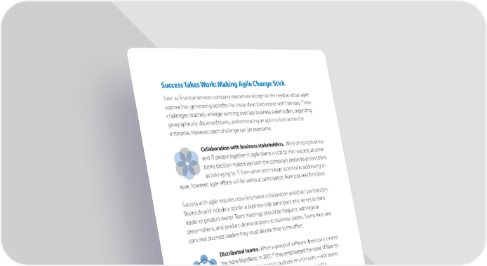 Success Takes Work: Making Agile Change Stick Even as financial services company executives recognize the need to adopt agile approaches, generating benefits like those described above won’t be easy. Three challenges routinely emerge: winning over key business stakeholders, organizing geographically dispersed teams, and embracing an agile culture across the enterprise. However, each challenge can be overcome. Collaboration with business stakeholders. While bringing business and IT people together in agile teams is vital to their success, at some banks decision-makers see both the company’s problems and solutions as belonging to IT. Even when technology is central to addressing an issue, however, agile efforts will fail without participation from business functions. Success with agile requires cross-functional collaboration and direct participation. Teams should include a role for a business-side participant who serves as team leader or product owner. Team meetings should be frequent, with regular presentations, and product demonstrations to business leaders. Teams must also convince business leaders they must devote time to the effort. Distributed teams. When a group of software developers created 60 the Agile Manifesto in 2001, they emphasized the value of face-to- face conversation.61 In today’s business environment—with teams often spread across the globe—that’s not always possible. Managing this challenge demands emphasizing the close communication required among all team members. Teams can still collaborate over long distances when they skillfully distribute work tasks. They can even hasten progress. This still requires regular meetings and leveraging collaboration tools. It also involves the extensive use of what’s referred to as ‘information radiators’: large charts, physical or digital, to track team member tasks and to communicate and sustain team momentum. This information must be available to all team members, whether or not they work in the same room. 60 Agile Manifesto, History: The Agile Manifesto, accessed March 13, 2018, http://agilemanifesto.org/history.html 61 Agile Manifesto, Principles Behind the Agile Manifesto, accessed March 13, 2018, http://agilemanifesto.org/ principles.html