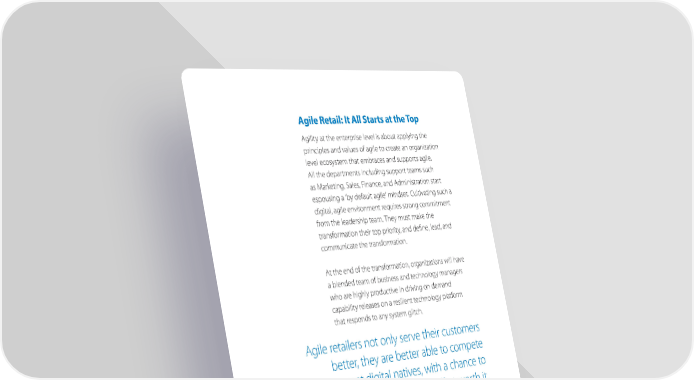 Agile Retail: It All Starts at the Top Agility at the enterprise level is about applying the principles and values of agile to create an organization level ecosystem that embraces and supports agile. All the departments including support teams such as Marketing, Sales, Finance, and Administration start espousing a ‘by default agile’ mindset. Cultivating such a digital, agile environment requires strong commitment from the leadership team. They must make the transformation their top priority, and define, lead, and communicate the transformation. At the end of the transformation, organizations will have a blended team of business and technology managers who are highly productive in driving on demand capability releases on a resilient technology platform that responds to any system glitch. Agile retailers not only serve their customers better, they are better able to compete with emergent digital natives, with a chance to win. This makes the effort worth it.