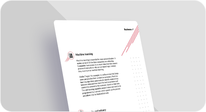 Machine learning Machine learning is essential for mass personalization: it makes sense of all the data companies are collecting. Companies have access to so much data that they cannot process it manually or rely on rule-based logic; instead, they must turn to machine learning. 3 Adobe Target, for example, is a software tool that helps users personalize their content to customers. Machine learning algorithms automatically identify relationships between data and then learn the best experience and content to present to the customer, based on that data. The self-learning capability means it does not need to be programmed by a person, which speeds up the process and allows it to be deployed at scale. Security and privacy If mass personalization is built upon customer data, then security and privacy are the foundations. Customers want personalization, but only if it is delivered to them securely; without it, customer trust – a priceless commodity – will be lost, and they may be more reluctant to share their data in future. Security technologies should therefore be paramount in businesses’ mass personalization strategies. 3 Adobe, Test and optimise digital experiences — every time, with Adobe Target, accessed October 28, 2019, https://www.adobe.com/uk/marketing/target.html 8