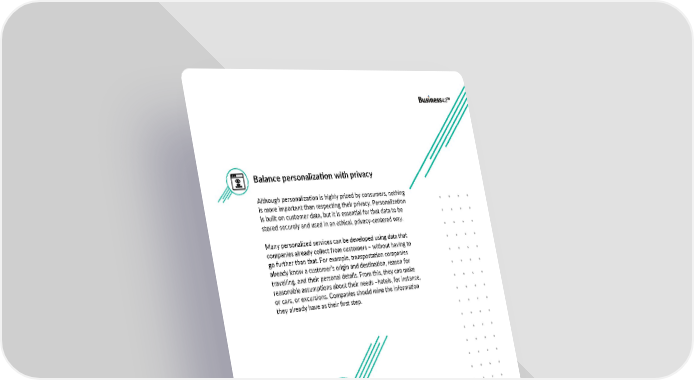 Balance personalization with privacy Although personalization is highly prized by consumers, nothing is more important than respecting their privacy. Personalization is built on customer data, but it is essential for that data to be stored securely and used in an ethical, privacy-centered way. Many personalized services can be developed using data that companies already collect from customers – without having to go further than that. For example, transportation companies already know a customer’s origin and destination, reason for travelling, and their personal details. From this, they can make reasonable assumptions about their needs –hotels, for instance, or cars, or excursions. Companies should mine the information they already have as their first step. 13