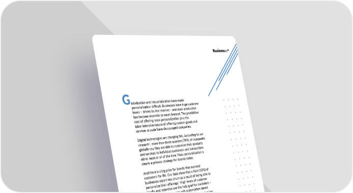 Globalization and industrialization have made personalization difficult. Businesses have huge customer bases – driven by the internet – and mass production has become essential to meet demand. The prohibitive cost of offering mass personalization plus the labor-intensive nature of offering custom goods and services at scale have discouraged companies. Digital technologies are changing this. According to our 1 research , more than three-quarters (78%) of companies globally say they are able to customize their products and services to individual customers and transactions either most or all of the time. Mass personalization is clearly a primary strategy for brands today. And there is a big prize for brands that succeed: customers for life. Our data show that a third (32%) of businesses report less churn as a result of being able to personalize their offerings.1 High levels of customer loyalty and retention are the holy grail for marketers – particularly for businesses with subscription-based business models – and personalization at scale is a key way to achieve this. TCS, Winning in a Business 4.0 World, https://www.business4.tcs.com/ 5