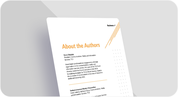 About the Authors Kamal Bhadada President, Communications, Media, and Information Services, TCS Kamal leads transformational engagements with large organizations in the communications, media, and information services sectors. He is part of the TCS North America Leadership Council and plays a vital role in formulating strategies for TCS in North America. Kamal is the co-owner of several patents in the areas of interactive media and streaming video. Sankaranarayanan (Shanky) Viswanathan Head, Industry Advisory Group, Communications, Media, and Information Services, TCS Shanky helps global companies drive and sustain business leadership with his strong industry and technology expertise. He is part of the review committee for telecom-related initiatives of the US-India Business Council, and holds multiple patents in digital-led telecom business solutions. 18