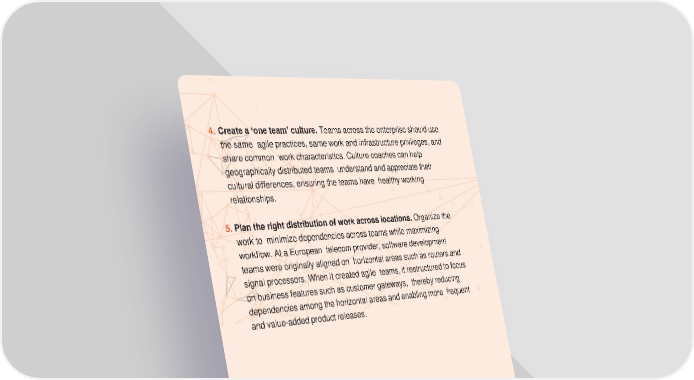 4. Create a ‘one team’ culture. Teams across the enterprise should use the same agile practices, same work and infrastructure privileges, and share common work characteristics. Culture coaches can help geographically distributed teams understand and appreciate their cultural differences, ensuring the teams have healthy working relationships. 5. Plan the right distribution of work across locations. Organize the work to minimize dependencies across teams while maximizing workflow. At a European telecom provider, software development teams were originally aligned on horizontal areas such as routers and signal processors. When it created agile teams, it restructured to focus on business features such as customer gateways, thereby reducing dependencies among the horizontal areas and enabling more frequent and value-added product releases.