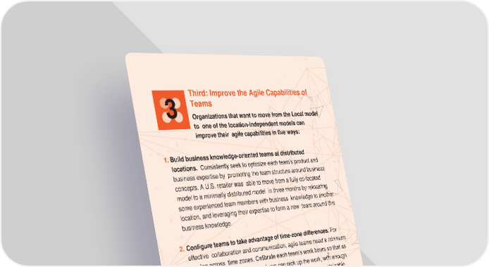 Third: Improve the Agile Capabilities of 3 Teams Organizations that want to move from the Local model to one of the location-independent models can improve their agile capabilities in five ways: 1. Build business knowledge-oriented teams at distributed locations. Consistently seek to optimize each team’s product and business expertise by promoting the team structure around business concepts. A U.S. retailer was able to move from a fully co-located model to a minimally distributed model in three months by relocating some experienced team members with business knowledge to another location, and leveraging their expertise to form a new team around this business knowledge. 2. Configure teams to take advantage of time-zone differences. For effective collaboration and communication, agile teams need a minimum overlap across time zones. Calibrate each team’s work hours so that as one team heads home, another team can pick up the work, with enough time for communication to ensure it continues at a steady, sustainable pace, with minimal confusion. Take the experience of a leading U.S. bank as an example. The bank had one team in Texas, and another in Chennai, India. The teams adjusted their hours to overlap based on how much time they needed to resolve their interdependencies. They became motivated to improve how they worked to reduce the number of overlapping hours they needed. 3. Minimize planning overhead. An Australian retailer synced up the sprints and product releases of its three agile teams, reducing the teams’ planning time by 20%. To achieve such results, it’s critical to automate as much of the teams’ work as possible using DevOps automation and design engineering practices.