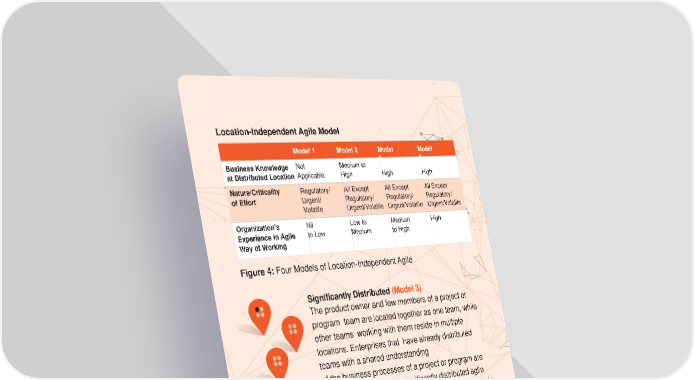 Location-Independent Agile Model Model 1 Model 2 Model Model Business Knowledge Not Medium to 3 4 at Distributed Location Applicable High High High Nature/Criticality Regulatory/ All Except All Except All Except of Effort Urgent/ Regulatory/ Regulatory/ Regulatory/ Volatile Urgent/Volatile Urgent/Volatile Urgent/Volatile Organization’s Nil Low to Medium High Experience in Agile to Low Medium to High Way of Working Figure 4: Four Models of Location-Independent Agile Significantly Distributed (Model 3) The product owner and few members of a project or program team are located together as one team, while other teams working with them reside in multiple locations. Enterprises that have already distributed teams with a shared understanding of the business processes of a project or program are well positioned to adopt significantly distributed agile work processes. This model not only offers the scale for enterprises to deliver large programs as well as frequent releases by increasing their access to the right talent, it also provides for business continuity. Fully Distributed (Model 4) The product owner may be at any site, while the rest of the project or program team members are grouped in agile teams across distributed locations. These teams each include product specialists with sufficient business knowledge to drive day-to- day decisions within a framework defined by the product owner. A Fully Distributed model is useful when enterprises need to empower teams with independent decision- making capability, such as when business experts do not have enough bandwidth to drive product leadership on a daily basis.