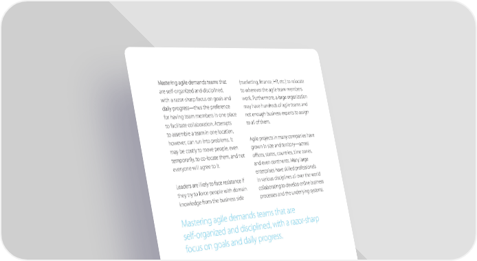 Mastering agile demands teams that (marketing, finance, HR, etc.) to relocate are self-organized and disciplined, to wherever the agile team members with a razor-sharp focus on goals and work. Furthermore, a large organization daily progress—thus the preference may have hundreds of agile teams and for having team members in one place not enough business experts to assign to facilitate collaboration. Attempts to all of them. to assemble a team in one location, however, can run into problems. It Agile projects in many companies have may be costly to move people, even grown in size and territory—across temporarily, to co-locate them, and not oces, states, countries, time zones, everyone will agree to it. and even continents. Many large enterprises have skilled professionals Leaders are likely to face resistance if in various disciplines all over the world they try to force people with domain collaborating to develop online business knowledge from the business side processes and the underlying systems. Mastering agile demands teams that are self-organized and disciplined, with a razor-sharp focus on goals and daily progress.