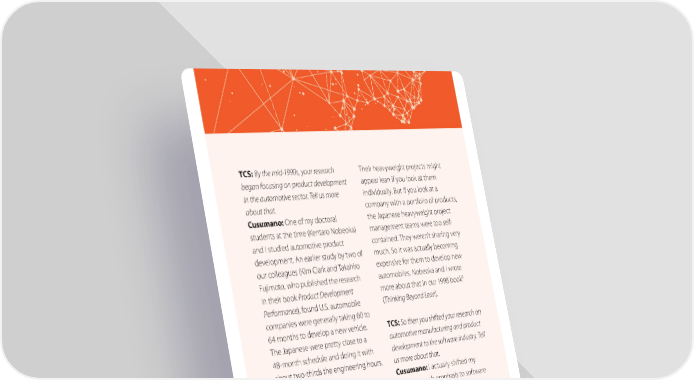 TCS: By the mid-1990s, your research Their heavyweight projects might began focusing on product development appear lean if you look at them in the automotive sector. Tell us more individually. But if you look at a about that. company with a portfolio of products, Cusumano: One of my doctoral the Japanese heavyweight project students at the time (Kentaro Nobeoka) management teams were too self- and I studied automotive product contained. They weren’t sharing very development. An earlier study by two of much. So it was actually becoming our colleagues (Kim Clark and Takahiro expensive for them to develop new Fujimoto, who published the research automobiles. Nobeoka and I wrote in their book Product Development more about that in our 1998 book8 Performance), found U.S. automobile (Thinking Beyond Lean). companies were generally taking 60 to 64 months to develop a new vehicle. TCS: So then you shifted your research on The Japanese were pretty close to a automotive manufacturing and product 48-month schedule and doing it with development to the software industry. Tell about two-thirds the engineering hours. us more about that. Cusumano: I actually shifted my But we had identified a problem in major research emphasis to software our research in the mid-1990s: The engineering even before I published Japanese automakers had become my first book in 1985 on the Japanese in many ways too lean. They weren’t automobile industry. Large-scale sharing much technology across software development became my projects within the same company. main focus from 1984. 8 Amazon, Thinking Beyond Lean, September 4,1998, accessed March 15, 2018, https://www.amazon.com/ Thinking-Beyond-Lean-Transforming-Development/dp/0684849186#reader_0684849186