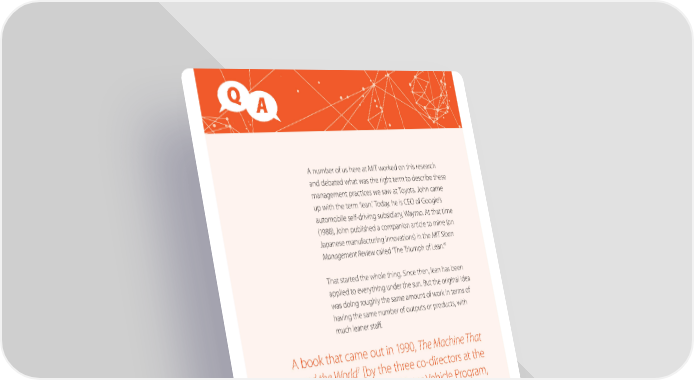 Q A A number of us here at MIT worked on this research and debated what was the right term to describe these management practices we saw at Toyota. John came up with the term ‘lean.’ Today, he is CEO of Google’s automobile self-driving subsidiary, Waymo. At that time (1988), John published a companion article to mine (on Japanese manufacturing innovations) in the MIT Sloan 6 Management Review called ‘The Triumph of Lean.’ That started the whole thing. Since then, lean has been applied to everything under the sun. But the original idea was doing roughly the same amount of work in terms of having the same number of outputs or products, with much leaner staff. A book that came out in 1990, The Machine That 7 Changed the World [by the three co-directors at the time of MIT’sInternational Motor Vehicle Program, James Womack, Daniel Jones, and Daniel Roos] documented that the Japanese car makers were assembling cars in less than half the time the U.S. manufacturers were—12 hours vs. 25 hours. 6 MIT Sloan Management Review, Triumph of the Lean Production System, Volume 30, Fall 1988, accessed March 15,2018, https://www.lean.org/downloads/MITSloan.pdf 7 Amazon, The Machine That Changed the World, 1990, accessed March 15, 2018, https://www.amazon.com/ Machine-That-Changed-World-Production/dp/B007ZHTZ8Y#reader_B007ZHTZ8Y