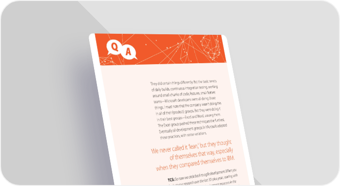 Q A They did certain things differently. But the basic tenets of daily builds, continuous integration testing, working around small chunks of code, features, small feature teams—Microsoft developers were all doing those things. I must note that the company wasn’t doing this in all of their [product] groups. But they were doing it in their best groups—Excel and Word, among them. The Excel group pushed these techniques the furthest. Eventually all development groups in Microsoft adopted these practices, with some variations. We never called it ‘lean,’ but they thought of themselves that way, especially when they compared themselves to IBM. TCS: So now we circle back to agile development. When you look at your research over the last 30-plus years, starting with manufacturing and product development processes in the auto industry, and then moving to software development and software business strategy more recently, are there any principles in developing and making cars that transcend to software?