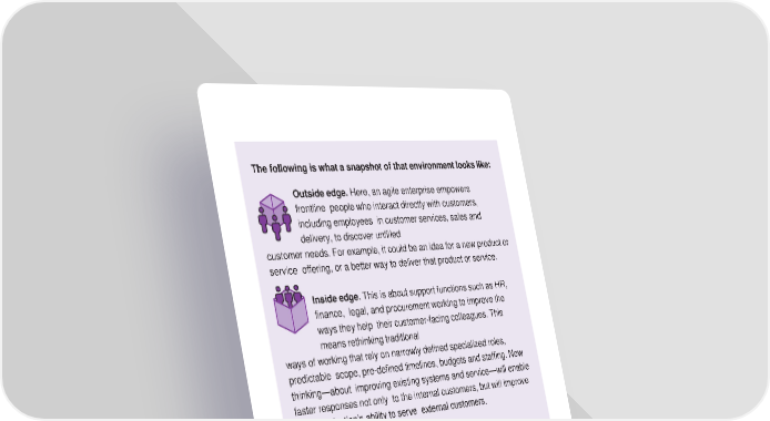 The following is what a snapshot of that environment looks like: Outside edge. Here, an agile enterprise empowers frontline people who interact directly with customers, including employees in customer services, sales and delivery, to discover unfilled customer needs. For example, it could be an idea for a new product or service offering, or a better way to deliver that product or service. Inside edge. This is about support functions such as HR, finance, legal, and procurement working to improve the ways they help their customer-facing colleagues. This means rethinking traditional ways of working that rely on narrowly defined specialized roles, predictable scope, pre-defined timelines, budgets and staffing. New thinking—about improving existing systems and service—will enable faster responses not only to the internal customers, but will improve the organization’s ability to serve external customers. For example, think of a traditional contracting process with fixed terms. If a new type of customer service option requires a more flexible scope with few pre-defined requirements, adaptive procurement, and legal functions will be poised to make that a reality faster than before. By adopting lean-agile ways of working where innovation is an everyday phenomenon, the people at the outside and inside edges of an agile enterprise will be able to create and implement new ideas more rapidly.